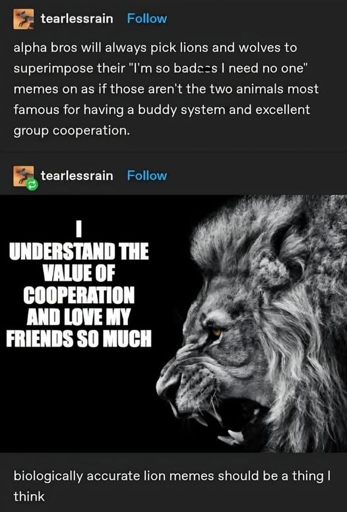 Psychologically accurate lion meme: “As a narcissistic wacko I yearn for a strictly hierarchical system, and I deserve to be at the top of it”