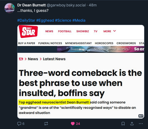 minus-squareBeeegScaaawyCripple@lemmy.worldlinkfedilinkEnglisharrow-up10·edit-22 months ago“who lit the fuse on your tampon, grandma?” gonna go ask my wife that, will advise on my survival edit: wife said it was too late for grave digging but i should get the shovel out early tomorrow morning