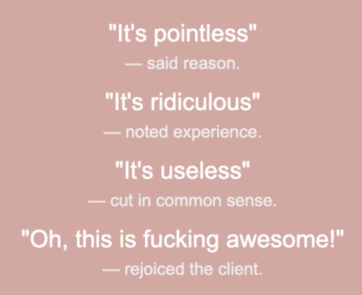 arrow-up1177imageCommon sense vs the clientlemmy.mlcm0002@lemmy.world to Programmer Humor@programming.dev · 8 days agomessage-square5linkfedilinkcross-posted to: [email protected]