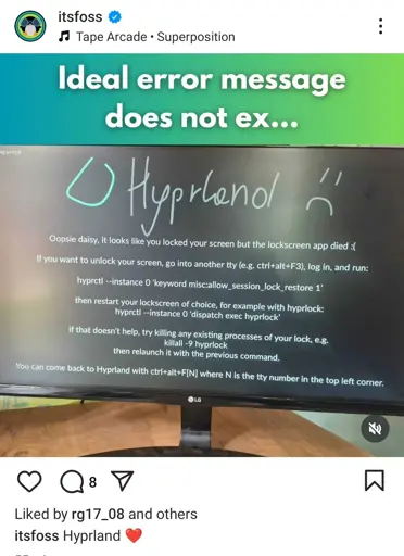 IO 😇@lemmy.blahaj.zone to Technology@beehaw.orgEnglish · 19 days agoitsfoss promotes hyprland on instagram!?lemmy.blahaj.zoneimagemessage-square41linkfedilinkarrow-up1135file-text