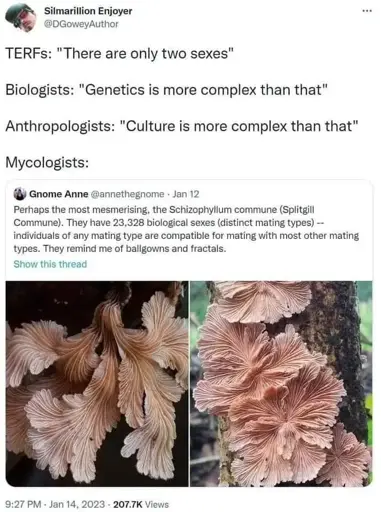 Not quite - mating types aren’t sex (though the post confuses them). Their gametes are the same size (isogamy), so it’s called mating types. Humans have gametes of different sizes, so we have sexes.