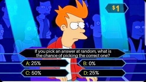 minus-squareXanthrax@lemmy.worldlinkfedilinkEnglisharrow-up1·16 days ago25/ 25 cancel each other. 50%.