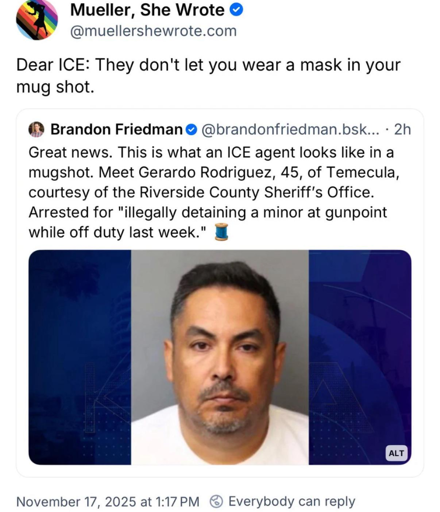 Just, ICE isn’t a police force related to a criminal matter. Immigration is civil under Article II. It’s why they cannot enter your home or a business on their own like cops can, and they cannot get a warrant from an immigration judge to do so since immigration proceedings are an executive agency matter under homeland security. That makes the immigration judge an administrative judge under Article II rather than a full judge under Article III. So, they cannot detain someone while off duty in any manner related to immigration.