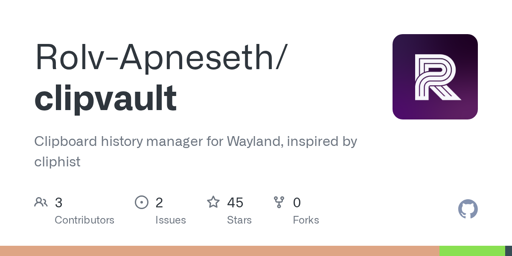 cm0002@no.lastname.nz to Linux@programming.dev · 15 days agoClipvault - Clipboard history manager for Waylandplus-squaregithub.comexternal-linkmessage-square0linkfedilinkarrow-up119