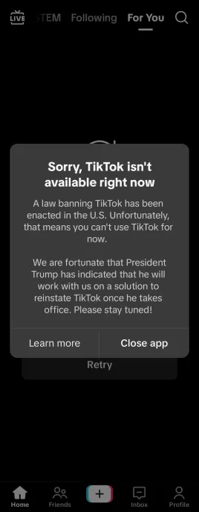 BREAKING - Tiktok has now SHUT DOWN SERVICES in the United States, noting “A law banning Tiktok has been enacted in the U.S. Unfortunately, that means you can’t use TikTok for now. We are fortunate that President Trump has indicated that he will work with us on a solution to reinstate Tiktok once he takes office. Please stay tuned!”