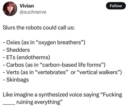 I like shedders the best lol. I’d lose my shit if a clanker ever called me that tho