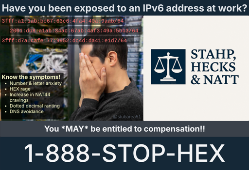 qaz@lemmy.world to Programmer Humor@programming.devEnglish · 21 days agoHave you been exposed to an IPv6 address at work?lemmy.worldimagemessage-square44linkfedilinkarrow-up1478
