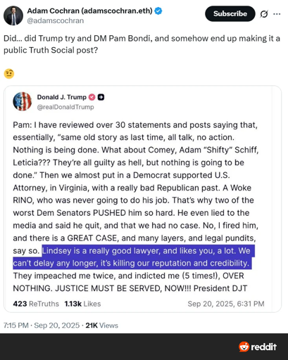 MuskyMelon@lemmy.world to politics @lemmy.world · edit-219 days agoTrump posts a Pam Bondi DM to public on TruthSocial? lemmy.worldimagemessage-square74linkfedilinkarrow-up1665file-text