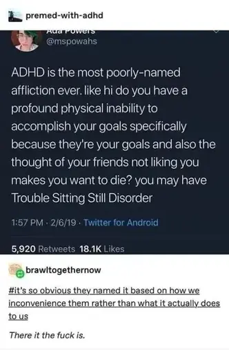 And so changing the name would have an immediate negative effect on the rights of those with the condition. So probably until we have some massive breakthrough about the thing we know as “ADHD”, it’s likely to keep the name.