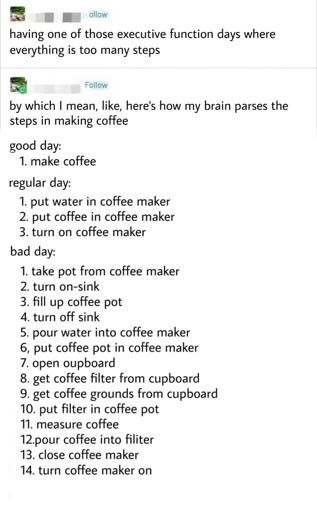 I always think in what you labeled as “bad day”. So everything seems harder than it is and takes more spoons. That’s why I need Adderal and coffee every day.